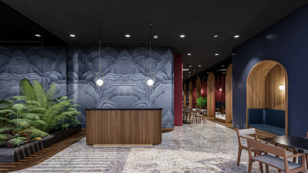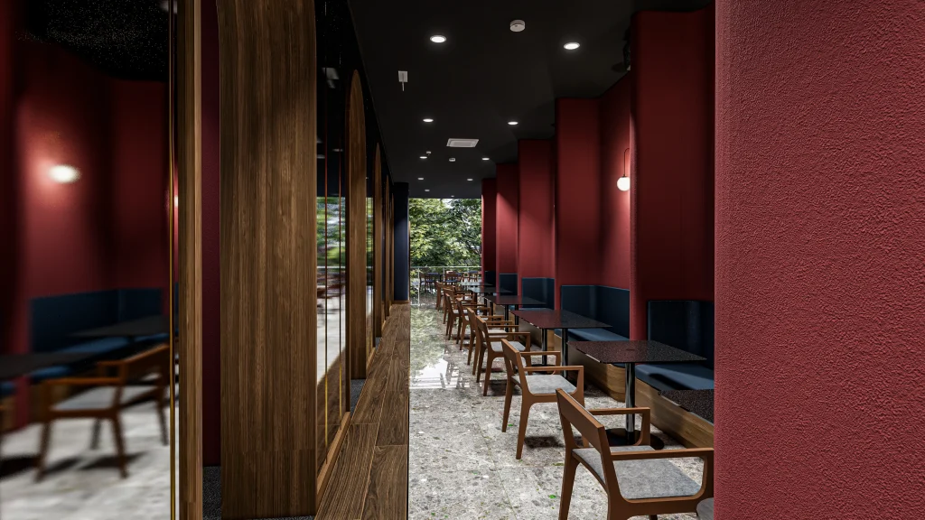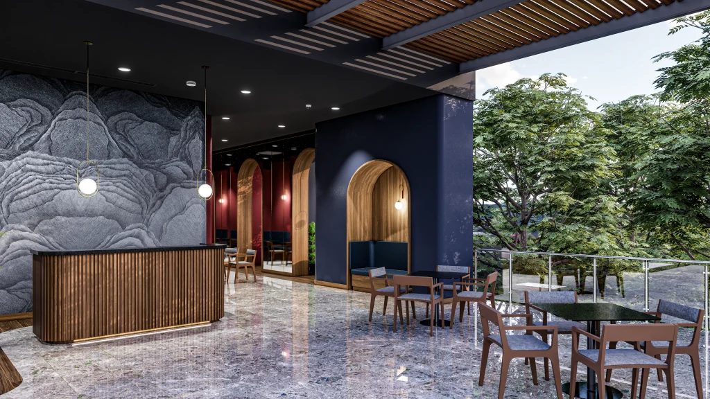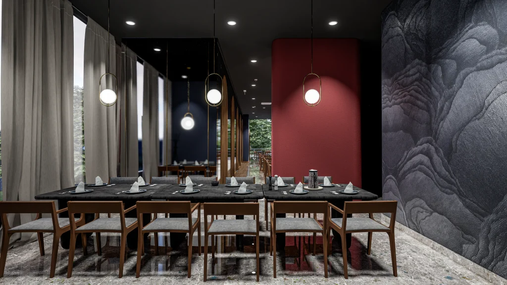 La iluminación cálida de las luminarias colgantes dialoga con la espléndida luz natural que baña la terraza y recepción, donde la vista al jardín y la vegetación interior ofrecen un toque de frescura y vitalidad. Pero más que belleza, Bar Rojo Restaurant es durabilidad con estilo: cada material está pensado para brindar resistencia y fácil limpieza sin comprometer el concepto estético que cautiva a sus visitantes.