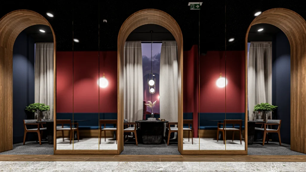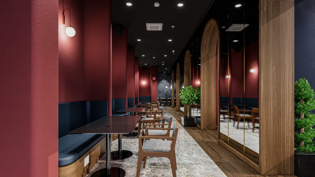 En sus muros, apreciamos una dupla de tonos ladrillo y azul profundo que, junto con su mobiliario — un conjunto de sillas mid-century y mesas color obsidiana—, refuerza el carácter refinado del área de comensales. El pasillo, revestido con altos espejos que le dan amplitud visual, resguarda pequeños privados donde reina un exquisito ambiente de lujosa intimidad.